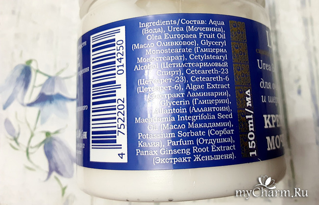 Состав крема радует: мочевина на 2 месте, также наличествуют масла (оливка, макадамия) и растительные экстракты (ламинария, женьшень). Производитель советует людям склонным к аллергии присматриваться к составу повнимательнее, а также не стоит забывать про тест на аллергию при первом знакомстве со средством.