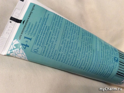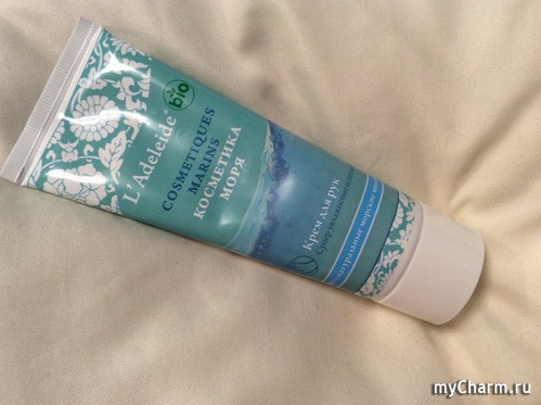 Стандартный тюбик крема имеет и стандартный объем в 75 мл с отвинчивающейся крышкой. Совершенно ожидаемо, что тюбик выполнен в лазурных тонах с изображением волны. Рядом с названием бренда на тюбике можно видеть приписку "bio", ведь L'Adeleide - интеллектуальная биокосметика от российских ученых. И в нашем креме действительно отсутствуют силиконы, минеральные масла, продукты синтетических жиров и нефтехимии, а так же продукты животного происхождения. Сзади можно увидеть знак о том, что продукция не тестируется на животных. Так же можно прочитать состав и на русском, и на английском языках. На иностранном языке я в составах не разбираюсь. Хотя и на русском языке тоже, но бросилось в глаза, что в состав входит несколько экстрактов трав (например, зверобоя, тимьяна, тысячелистника). Не забываем и про море, так что в составе действительно можно заметить и экстракт морских минералов.