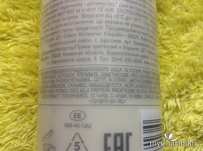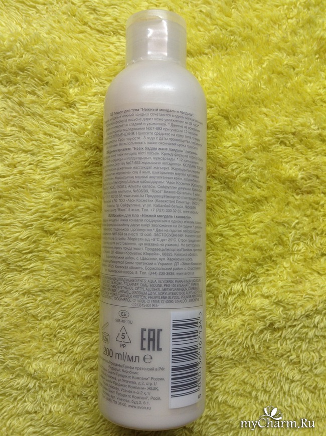 Бутыль с лосьоном – 200 мл, прозрачно-белого цвета. На переднем плане продукта видим рисунок с нежными цветами ландыша и орешков миндаля. Крышка откидная, открывается одним пальцем с легкостью. На обратной стороне бутыли производитель предоставил информацию о продукте, способе применения, составе и своем месте нахождении. Срок годности товара – 3 года, после вскрытия флакона – 12 месяцев.Обещания от Avon: