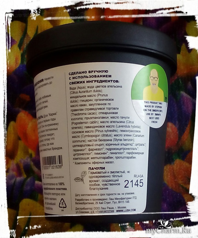 Целых 225 грамм сплошного ароматного удовольствия. Как оказалось, этот аромат открыл миру создатель бренда LUSH Марк ещё в первые годы существования. И по прежнему он востребован и любим многочисленными поклонниками их косметики по всему миру. Аромат "Кармы" считается визитной карточкой бренда. Скажите, ну как можно пройти мимо после такой презентации.