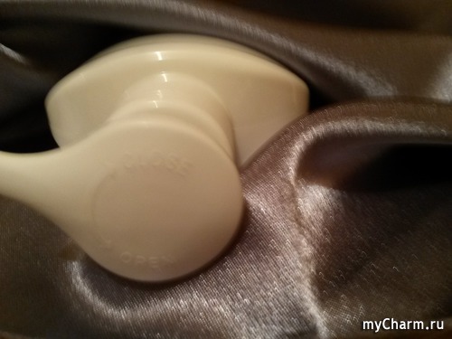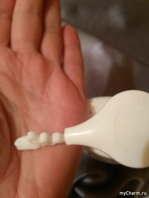 Носик дозатора приводим в нужное положение и легким нажатием получаю порцию крема, которую массажными движениями втираю в кожу.