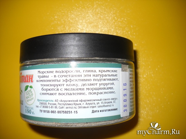 А рядышком можно ознакомиться с информацией о производителе: эту великолепную убтан-маску производит АО «Алуштинский эфиромасличный совхоз-завод», расположенный в Крыму, в городе Алушта. И здесь же указана дата производства убтана – 30 сентября текущего года. Одним словом, наисвежайший продукт!