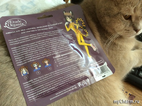 Итак, это не просто тканевая маска, а маска с нанесенным рисунком. В моем случае этот рисунок должен был превратить меня из обычного человека в леопарда. Получилось ли? Узнаем позже, а пока изучим упаковку сзади. Там столько информации.