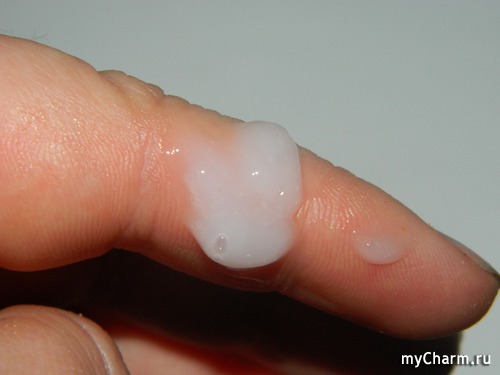 Маска белого цвета с глянцем, запах очень приятный – луговых трав. По консистенции и оттенку она мне напомнили негустой молочный кисилёк.