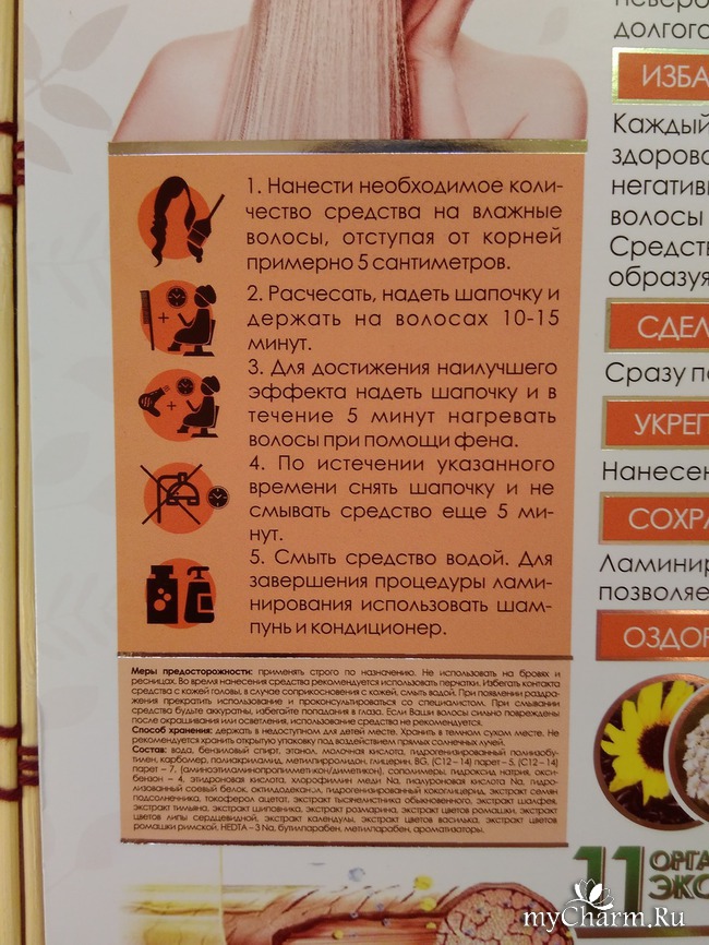 На самом деле не все так страшно, а совсем наоборот, все просто. Берем небольшое количество средства и наносим на влажные волосы. Расчесываем, чтобы каждый волос смог как следует пропитаться. Надеваем шапочку для душа и оставляем маску на десять-пятнадцать минут. Чтобы ламинирование прошло максимально эффективно, волосы нужно пять минут греть феном (через шапочку) - я так и делаю. После шапочку снимаем и ждем еще пять минут, затем средство смываем – сначала водой, следом – шампунем. Завершаем процедуру использованием кондиционера. К слову, мои шампунь с кондиционером тоже с натуральным составом, без сульфатов. Поэтому вся польза ламинирующего средства остается на волосах, а не смывается полностью.