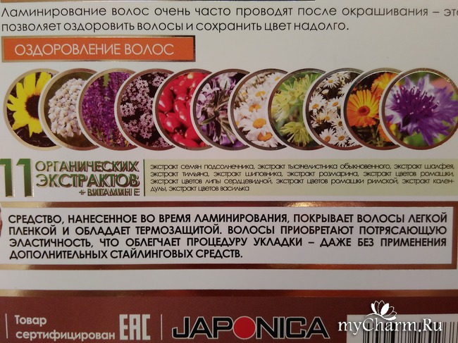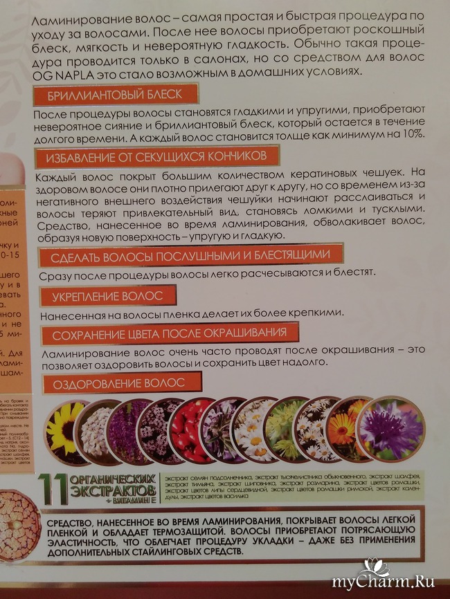 Ламинирующее средство не просто делает волосы гладкими, но и дарит им естественный блеск, препятствует появлению секущихся кончиков, укрощает даже самую строптивую шевелюру, покрывает волосы незаметной защитной пленкой, оздоравливает локоны. Подходит оно и для окрашенных волос, не вымывает цвет, а наоборот, способствует его сохранению. После применения данной маски волосы спокойно можно уложить феном, утюжком или плойкой – волосы надежно защищены от термического воздействия. Не понадобятся и стайлинговые средства: волосы порадуют своей послушностью и легко дадутся укладке.