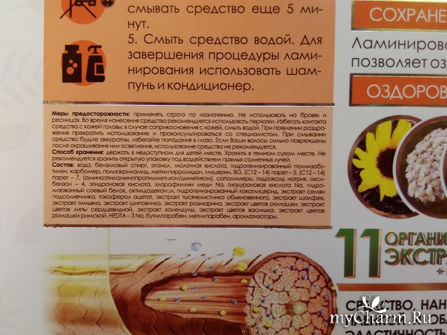 Процедура ламинирования занимает не более получаса/сорока минут, даже с учетом укладки волос феном. Но, прежде чем приступить к процедуре, очень важно ознакомиться с мерами предосторожности. Несмотря на обилие натуральных компонентов, средство не является совсем безопасным для состояния кожи: оно может вызвать сухость и жжение. Поэтому наносить маску следует в перчатках, на 5 см отступая от корней волос. Конечно же, берегите глаза, не позволяйте средству случайно стечь. Средство для ламинирования не следует применять, если ваши волосы сильно повреждены и обессилены: в таком случае пользы для них будет мало.