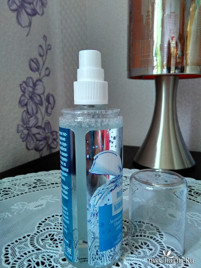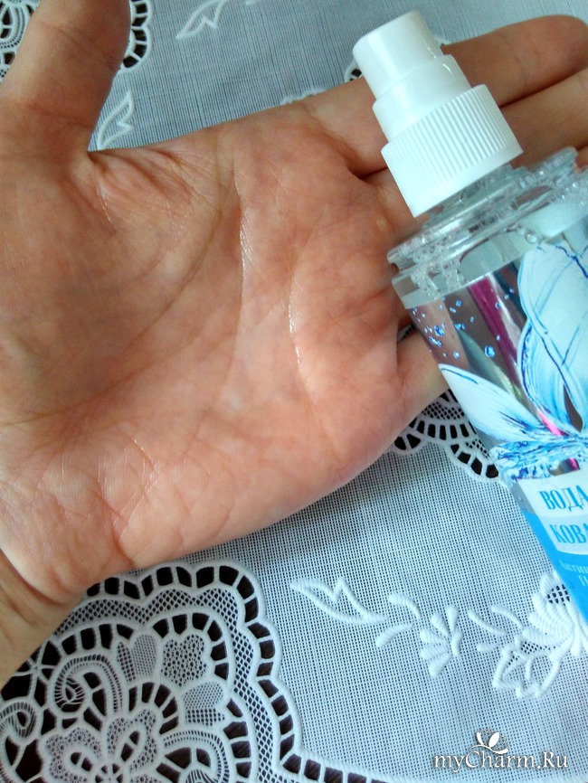 Используется вода при помощи дозатора, позволяющего равномерно распылить воду на коже лица. Нажимается он очень плавно, нисколько не заедает.