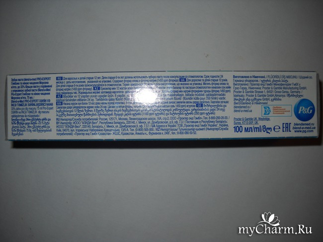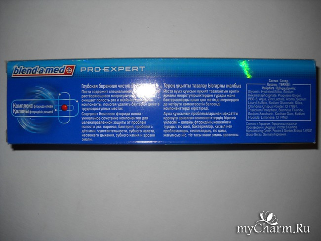 На обратной стороне коробочки тоже немало полезной информации – оказывается, активные компоненты в составе зубной пасты «Ледяная мята» способствуют удалению вредоносных бактерий даже в самых труднодоступных местах. А содержащийся в ней комплекс фторида олова направлен на защиту практически от любых проблем полости рта. Здесь же указан и состав чудодейственного средства – ничего особо криминального мною в нем не обнаружено.