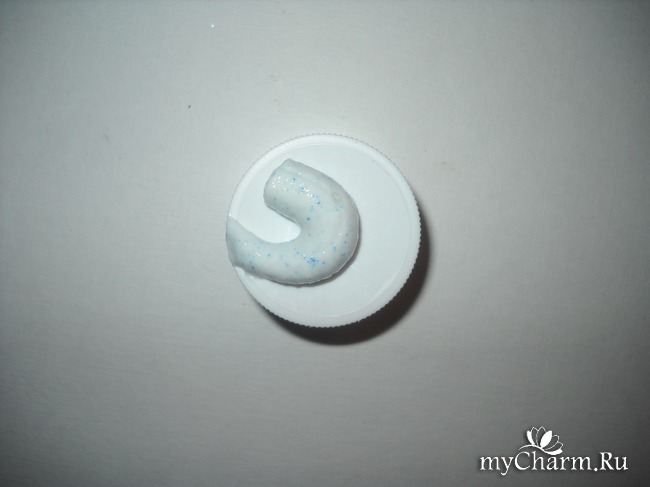 Содержимое тюбика (то есть сама зубная паста) окрашено в белый цвет и испещрено крошечными синенькими точечками – должно быть, это и есть обещанные растворяющиеся микрогранулы.