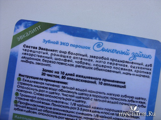 Кроме того, зубной порошок «Солнечный Зайчик» удобен в использовании. А еще он имеет приятный аромат с выдающимися нотками эвкалипта, который я очень люблю. Кстати, если сравнивать с другими порошками, которые я получила от Фабрики трав, он мне понравился больше всех. Щетка после использования остается прежней, то бишь в цвете не меняется, щетки и основание не забиваются.