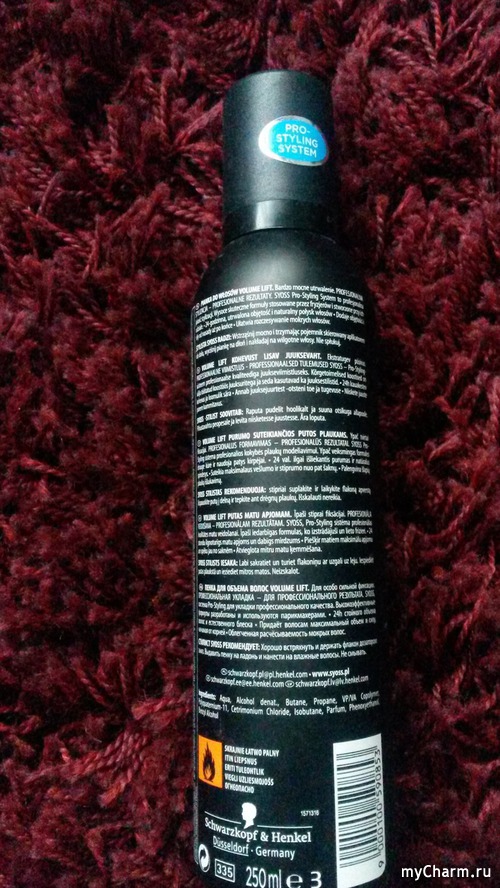 После всех процедур укладки феном, утюжком и, последний штрих, легким движением руки, распыляю на волосы лак этого же брэнда с 48 часовым действием. Волосы блестят, уложены, такое ощущение, что волосы как бы стали потяжелее, этот эффект мне очень нравится, прическа держится неделю и объем присутствует. Мусс очень хорошо справляется со своей задачей. Конечное, за неделю незначительные поправки делаю, но это не считается, неделя не 24 часа. Флакончика хватает на долго, так как на одну укладку у меня уходит совсем немного, пользуюсь им уже более трех месяцев еженедельно, а он все кормит меня! Всем, кто любит объем, кому нужна сильная фиксация, рекомендую мусс Syoss Volume Lift, не пожалеете. Хочу закончить свой обзор словами великой Софи Лорен "Прическа влияет на то, как складывается ваш день, а в итоге и всяжизнь». Будем помнить и выполнять рекомендации звезды.