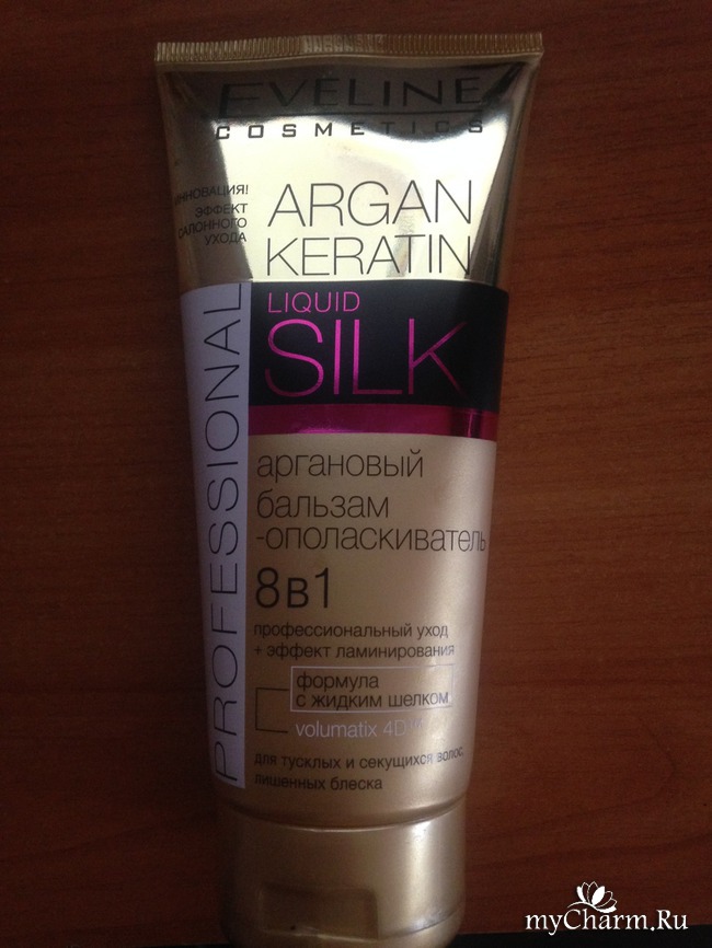 Представляю вашему вниманию аргановый бальзам-ополаскиватель от Eveline. Помимо того, что этот бальзам оказывает профессиональный уход, так еще и эффект ламинирования. В основе лежит специально разработанная формула: масло аргана + кератин + жидкий шелк. Именно благодаря этому производитель обещает целых 8 результатов после использования.