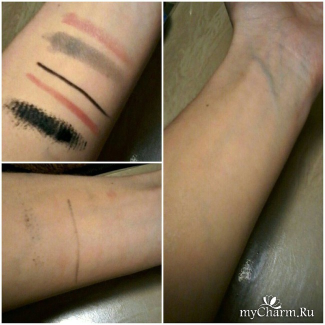 В качестве эксперимента, на внутреннюю сторону предплечья нанесла: тональную основу, сверху помаду, карандаш для глаз, карандаш для губ, отдельно тушь и тени.