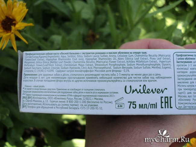 А теперь о хорошем. Обилие полезных экстрактов в пасте как-то успокаивает и даже компенсирует то, что оказалось сомнительным. Есть очень хорошие ингредиенты: экстракт ромашки, масло облепихи, отвар пяти трав, растительный комплекс с полипренолами. Обо всех полезностях этих ингредиентов подробно рассказывается на упаковке: