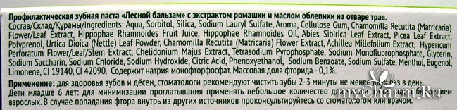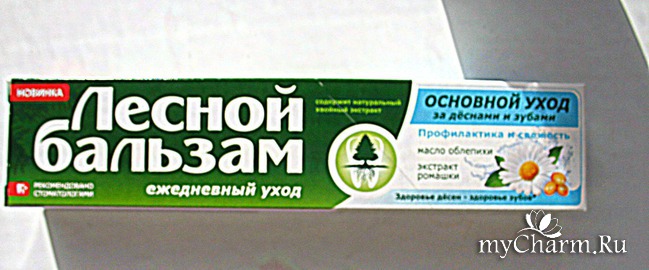И вот, стоя перед прилавком магазина с зубными пастами, мой взор нашел подопытного. Цена которого, кстати сказать, была на том же уровне, что и у моих привычных помощников по уходу за зубками. Так зубная паста "Лесной бальзам" появилась в моем доме. Вот она:Рассмотрев коробочку, обнаружила следующую информацию: