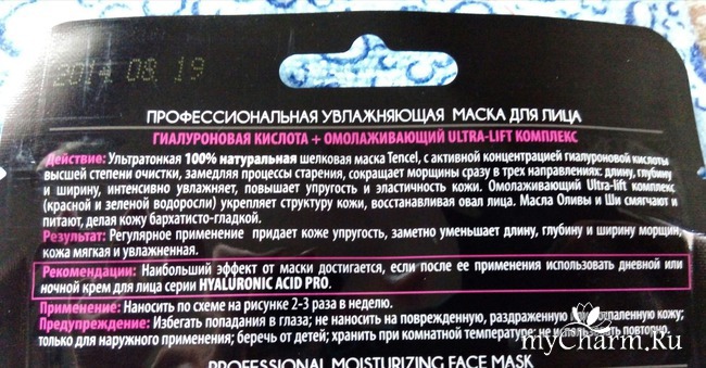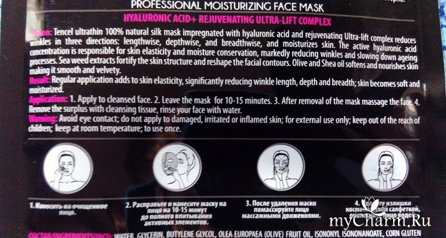 Начато, как обычно, с предназначения, обещания, рекомендаций к применению маски, а также и предупреждения об одноразовости маски, об избегании попадания пропитки маски в глаза и в рот, а также о сохранности маски от детей и хранение при комнатной температуре.