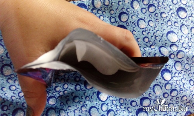 Ну, а теперь пришло время заглянуть в этот симпатичный конвертик. Вскрываем аккурат по рискам: отрывается без проблем. И внутри, вся в полезной пропитке, свернута и сама тканевая масочка.