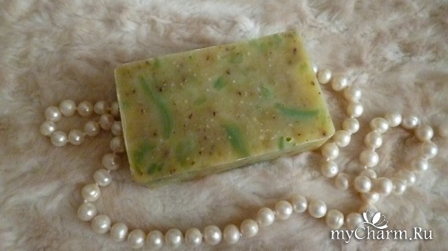 Само мыло имеет желто-зеленый цвет с зелеными вкраплениями и молотыми сухими листьями мяты.