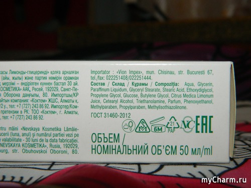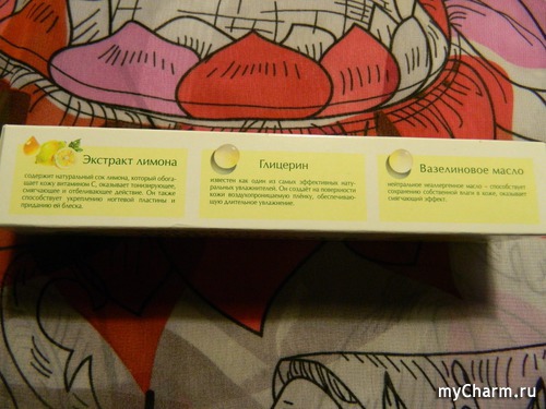 Первое, о чём заявляет производитель, в состав крема входят экстракт лимона, вазелиновое масло и глицерин. Всё это должно напитать кожу, сделать её мягкой, гладкой, увлажнённой, осветлить и укрепить ногти. Честно говоря, в подобные обещания верится с трудом.
