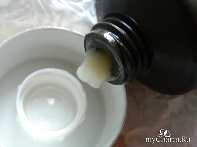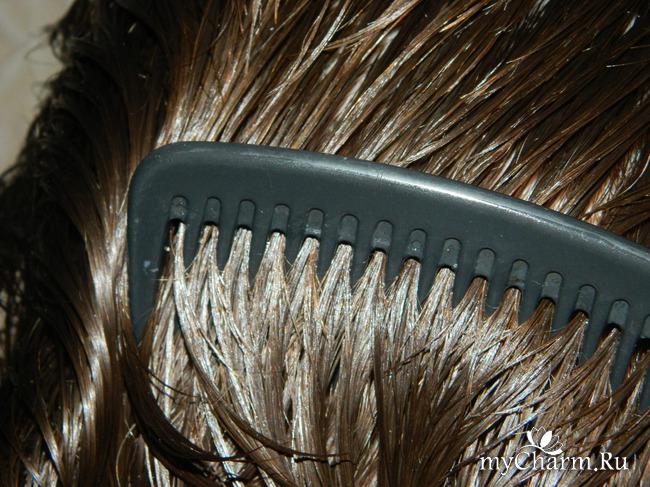 Перед тем как нанести маску, я тщательно мою волосы, ополаскиваю их и промокаю полотенцем. Затем на влажные волосы наношу небольшое количество (приблизительно как на снимке ниже) средства и с помощью расчёски распределяю по волосам (она легко распределяется).