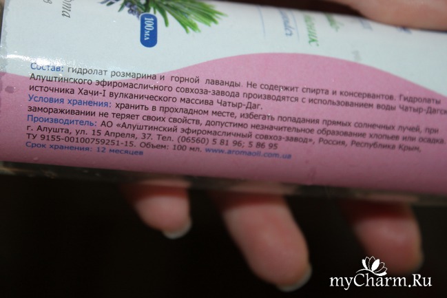Немного о составе гидролата: продуктов тут немного, думаю, о плюсах минимального состава все итак знают, в подробности вдаваться не буду. Гидролат розмарина, гидролат горной лаванды и воды из Чатыр-Дагского источника. Три компонента, которые творят чудеса.