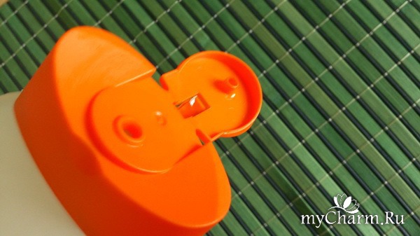 Упаковка его очень яркая в сравнении с другими, на полке в магазине сразу кидалась в глаза: белый высокий флакон и ярко-оранжевая крышка, в тон крышке и оформление на этикетке. Крышка закрывается до щелчка, не тугая, открывается легко.