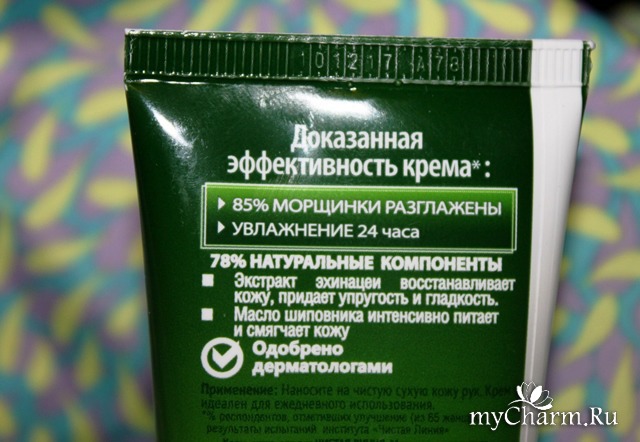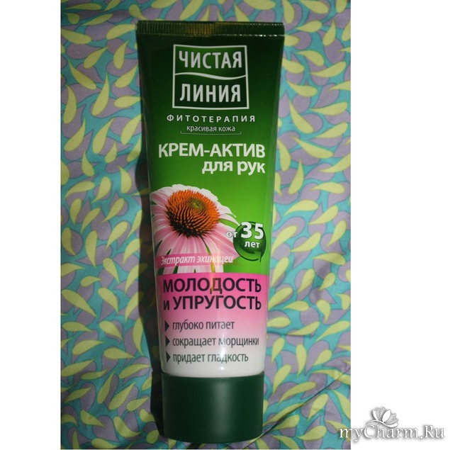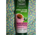 Крем-актив для рук Чистая линия фитотерапия Молодость и упругость с экстрактом эхинацеи (от 35 лет). Купила я его аж в Туле (несмотря на то, что живу в Москве) по случаю. А вот в столице пока не попадался на глаза. Чудеса. Приобрела этот крем только исходя из зрительной симпатии. Магазинчик был маленький в старом стиле, когда все средства стоят через прилавок у продавца за спиной. Просить пробовать или нюхать каждое как-то неловко. Вот я и купила исходя из дистанционного выбора))))