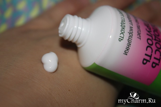 Скажу честно, чтобы увидеть состав, нужно сильно постараться. На моей тубе он оказался не совсем четким и очень мелким. Из тех компонентов, которые я смогла прочитать, меня порадовали: масло ши, экстракт розы шиповника, масло сои, сок груши, экстракт японской айвы, экстракт цветов японкой сафоры, экстракт эхинацеи, экстракт плосколистной ванили, экстракт камелии, масло сандалового дерева. Далее следует перечень различных «химических» наименований и аббревиатур. Хорошей новостью стало наличие глицеринов, касторового масла и отсутствие парабенов. Но закралось-таки в конце списка парочка «неприятных» названий, которые могут быть вредными в случае несоблюдения норм дозировки.