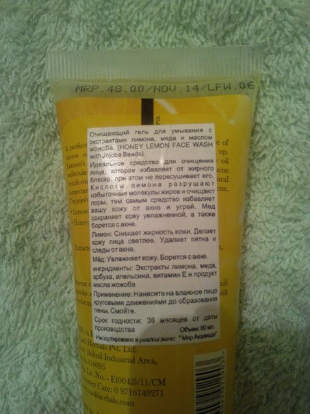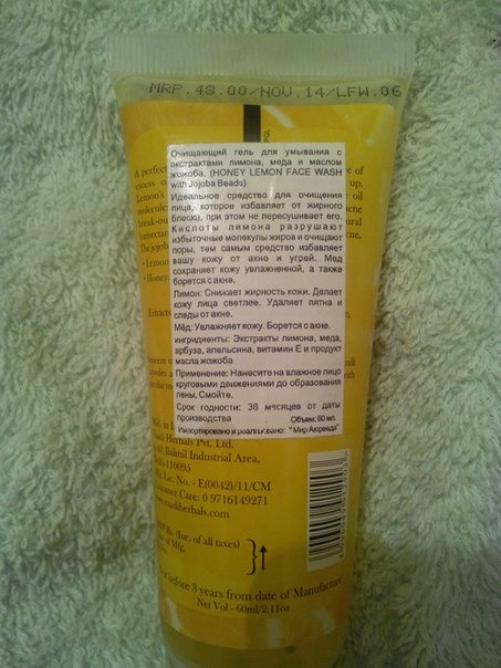 На обороте тюбика, на английском языке написан производитель (Индия), его адрес, состав, срок годности. Сверху мы видим наклейку на русском (которая, кстати, до сих пор осталась – вода ее не испортила, предусмотрительный продавец, однако!).