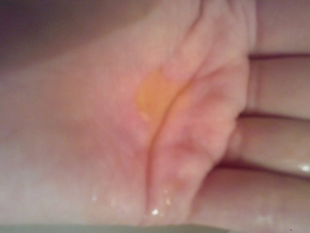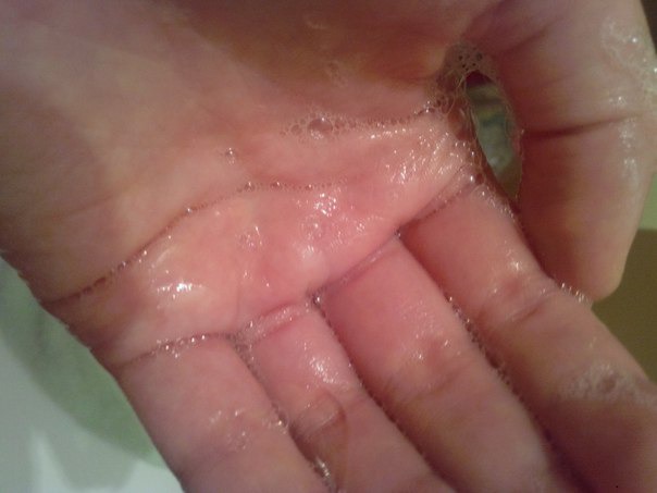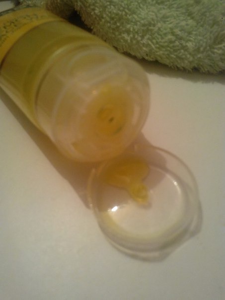 Наливаю немного геля на ладошку, он приятного желтоватого цвета. Консистенция средства жидковатая, даже очень. Непривычно! Также в нем есть гранулы жожоба зеленого цвета – на фото не попало – которые хорошо растворяются на лице.