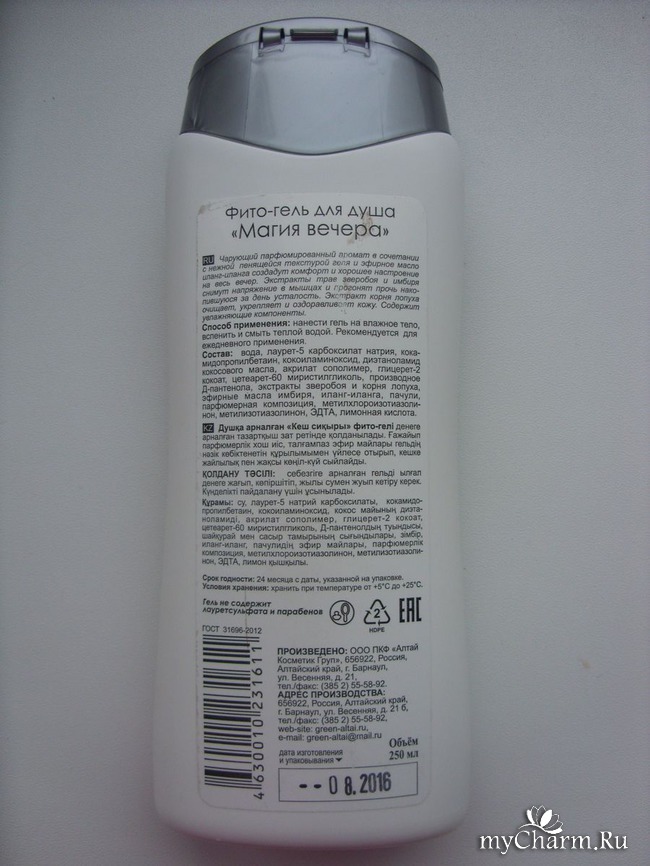 Не так давно арсенал средств, предназначенных для водных процедур и очищения, пополнился новым жителем. Им стал Фито-гель для душа афродизиак «Магия вечера» от полюбившегося мною бренда «Зеленый Алтай». Сей чудесный продукт представлен в пластиковом флаконе объемом 250 мл, оснащенном с обратной стороны этикеткой, повествующей о составе, способе применения, свойствах и прочих важных аспектах, которые требуются покупателю для ознакомления. Кстати, обратная сторона флакона красуется на фотоснимке в интернет-магазине бренда. Заметьте, такой подход присущ не всем представителям косметического мира. Часто производители умалчивают о полном списке составляющих продукта.