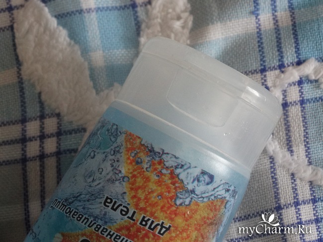 На лицевой стороне её изображены морская звезда, ракушка и брызги воды. В общем-то неудивительно, если учесть, что производитель заявляет о том, что в составе средства соли мёртвого моря.