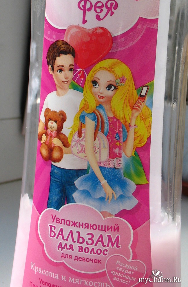 Этикетка выполнена вполне себе по - девичьи: в розовых тонах, сердечки, милый наряд на изображенной девочке.