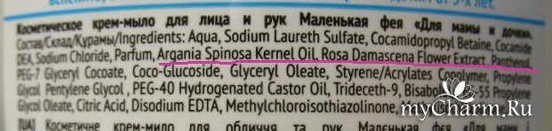 Что еще меня побудило к покупке этого средства, так это то, что это крем-мыло, т. е. оно должно быть особенно нежным, а так же содержать полезные смягчающие компоненты. В данном случае - масло арганы, экстракт розы и пантенол.