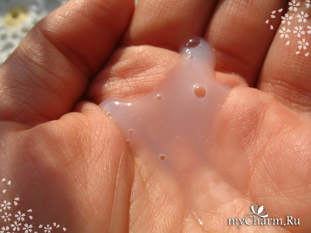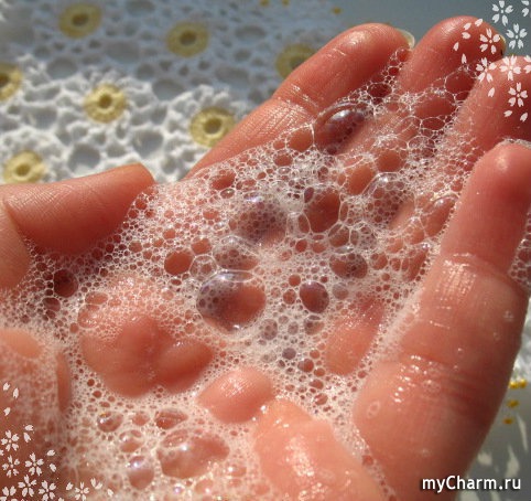 Само средство белого цвета, но не яркого. На ощупь действительно очень мягкое и нежное. Мылится хорошо, в результате чего получается вот такая легкая ароматная пенка: