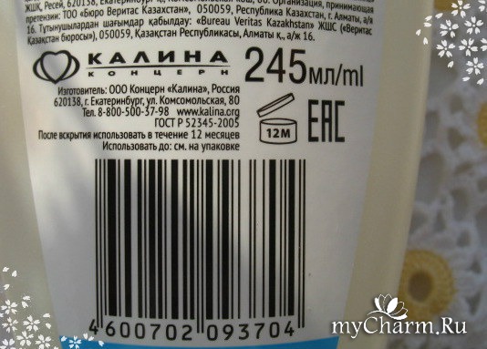 Здесь же указан производитель - ООО Концерн "Калина", а так же информация о том, что с момента вскрытия средство нужно использовать в течение 12 месяцев.