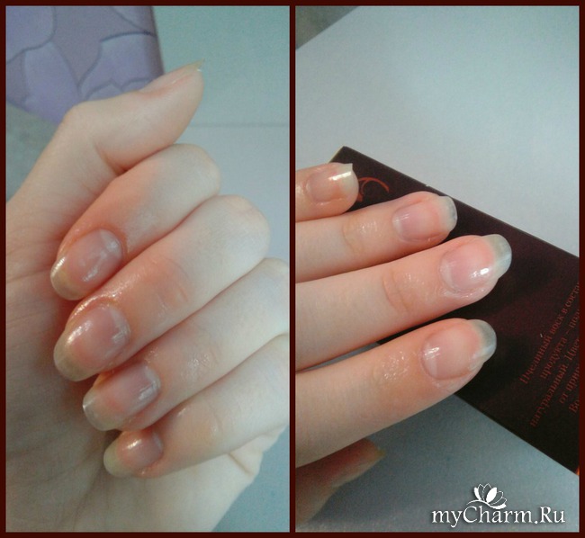 Перед тем, как обрабатывать ноготки, наношу на них и на кожу вокруг воск, втираю массирующими движениями и вижу блеск от масел, а когда воск впитается, ноготки напитаны витаминами и приобретают здоровый вид, приятный цвет и сияют красотой.