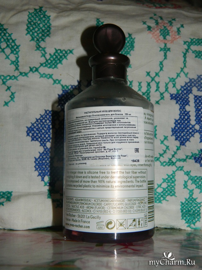 Применять данное средство нужно не так, как привычный нам уксус (разводить в энном количестве воды и ополаскивать волосы). Его нужно наносить непосредственно на влажные волосы после помывки с шампунем, затем смывать водой. Сколько по времени выдерживать средство на волосах (полминуты, минуту) производитель не говорит. Вроде как нанёс и тут же смыл.