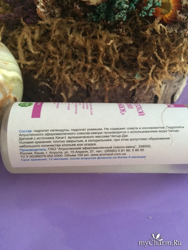 Состав вполне скромный (также состоит из гидролатов двух растений: календулы и ромашки) и как всегда полностью натуральный (подтверждено знаком).