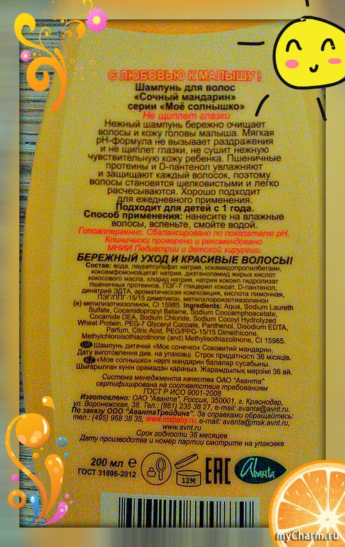 Здесь же, на лицевой стороне есть информация, что шампунь гипоаллергенный, подходит для детей старше года и содержит в своем составе пшеничные протеины и D-пантенол.