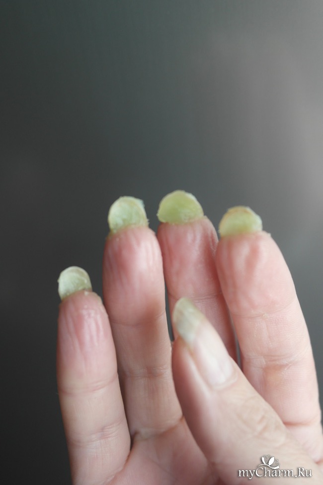 Консистенция кремовая, маслянистая, нежно-зеленого цвета. Приятный, нежный, еле уловимый аромат. Намазываю сверху на ногтевую пластину каждого пальца, слегка растирая. Затем под свободный край каждого ноготка наношу еще маску. Ощущения приятные.