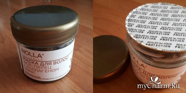 Масочка пришла ко мне в паре со второй маской Nolla, а именно маской для волос мёд & корица c коллагеном, а к ним в придачу еще и несколько шапочек для душа и большая термо-шапочка розового цвета с красивыми переливающимся блеском. Обьемом маска бей & перец с коллагеном фирмы NOLLA, поменьше, чем её подружка, поэтому и к концу подошла значительно опередив её. Ну, а теперь перехожу к описанию средства.
