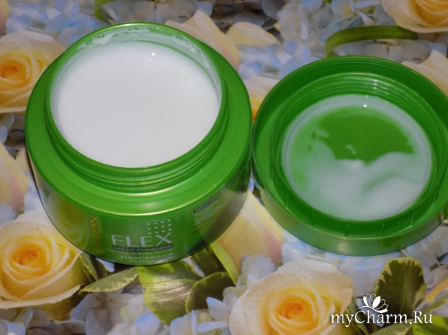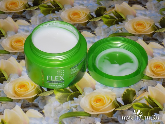 Это те возможности маски, которые обещают производители серии средств Revlon Flex с упаковки или с официального сайта-представителя бренда. Итак, баночка, как видите, довольно увесистая. Цвет у банки ярко зеленый. Содержимое внутри баночки белоснежное. Маска, как густой крем. Не течет, не капает, быстро распределяется, мягко и нежно по волосам. Смывается тоже на раз, легко и просто. Я ее использую и на влажные волосы после того, как вымыла их шампунем. Либо применяю до мытья волос. Смазываю чуть увлажненные волосы маской, затем надеваю полиэтиленовую шапочку на них и хожу с маской пол часика. На самом деле, удобство маски в том, что ее можно не держать долго на волосах, а смыть уже через 1-2 минуты после нанесения.