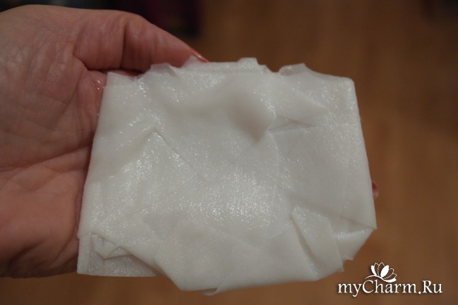 Аккуратно разворачиваю и прикладываю к лицу и на область шеи. Разглаживаю складочки, чтобы ткань плотно прилегала к коже. Ткань пропитана составом густым слоем. Причем не только с внутренней стороны, но и с наружной. Аромат есть, но не свежести трав, а парфюмированный (по моим критериям, даже перебор с ароматом). Подержала 20 минут, сфотографировала себя и сняла.