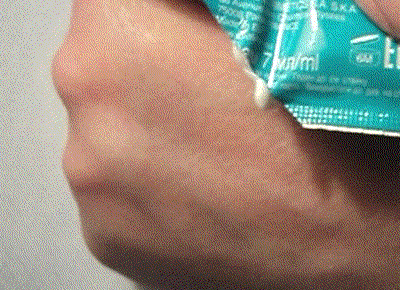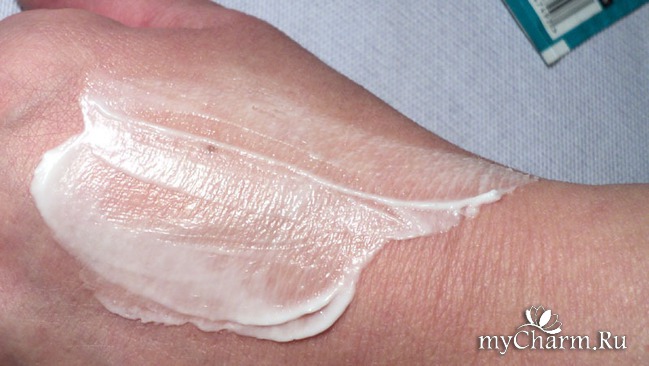 Вот таким белым слоем, как показано на упаковке, этот состав не ложится. У меня он распределился как обычный крем (густой крем). А затем эти белые разводы и пятны исчезли, состав начал впитываться. То есть на коже остался только чуть жирный след, а не белый.