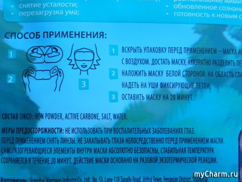 В первое мгновение после вскрытия пакетика маска холодная, но постепенно она начинает нагреваться – это вступают в реакцию с кислородом активные компоненты, которые содержатся в специальных «кармашках» между тканью и картинкой, - активный карбон, порошок железа, соль и вода. Все они безвредны.