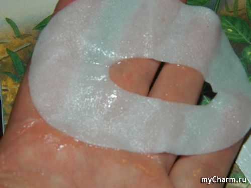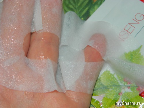 Пакетик с маской открывается легко, благодаря специальной насечке. Внутри – тканевая масочка, щедро пропитанная белой кремообразной массой с ярко выраженным запахом женьшеня. Возможно, удачно подобрана отдушка (она, кстати, имеется в составе), а возможно аромат исходит от экстракта женьшеня, ведь его довольно много. Но так или иначе – аромат характерен для корня этого целебного растения.
