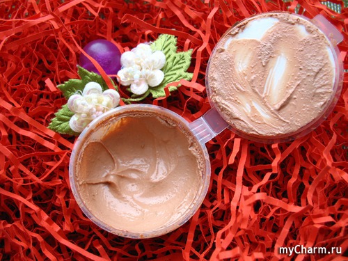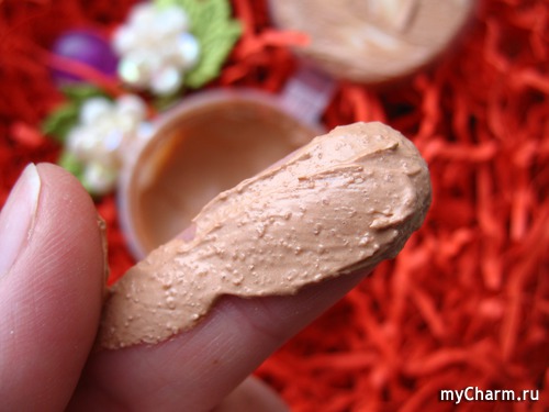 А видим мы персиково-розоватую массу с очень приятным древесно-ореховым ароматом! Запах очень тонкий, я бы даже сказала аппетитный: я очень люблю всякие орешки! Однако, забегая немного вперед отмечу, что в составе они отсутствуют. Возможно, это масло розового дерева дает такой оттенок, а может и порошок бамбука...