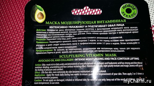 На обратной стороне можно ознакомиться о действии, применении данной маски. Также производитель обещает, что маска подтягивает и увлажняет самую сухую кожу лица. Ну что будем проверять на себе, действительно ли это так. Информация есть на иностранном языке, так же и на русском.